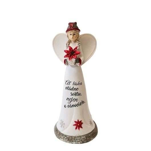 Polyresinová figurka anděla s vánoční hvězdou a nápisem Ať láska vládne světu nejen o Vánocích.