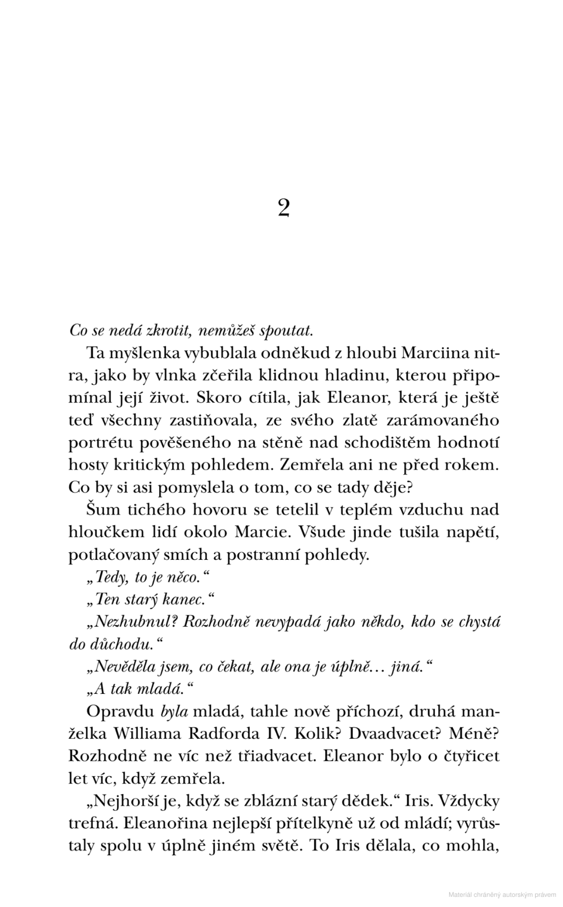 Manželství s Jasonem katapultovalo Marcie, jeho druhou ženu, do světa jižanských elit. Světa starých peněz, starých vazeb a starých tajemství. Světa, který se otřese, když do něj vstoupí další druhá manželka, mladší a žádoucnější. Někdy stačí jediný krok špatným směrem, aby všechny jistoty vzaly za své.