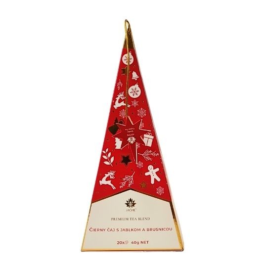 Dárková sada černého čaje s jablkem a brusinkou obsahuje 20 čajových sáčků s lahodným černým čajem ze Srí Lanky, který je ochucen jemnou kombinací jablka a brusinky. Elegantní balení ve tvaru pyramidy s vánočním motivem.