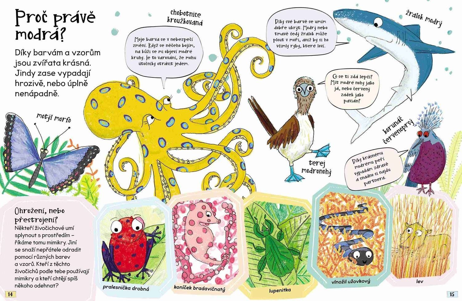 Spousta zajímavostí i legrační ilustrace ti otevřou oči: zvířata jsou tak zvláštní, divoká, krásná a neuvěřitelná stvoření! A jistě se zase budeš ptát. Proč polykají krokodýli kameny? Od čeho jsou plameňáci růžoví? Jsou zvířata u jídla vybíravá? K čemu mají kočky vousy? Čím čichají hadi? Mají všechna zvířata dvě oči? Proč krabi utíkají bokem? Kam schovávají tučňáci svá vajíčka? Je netopýr pták? A prozradíme ti třeba i to, jak některá zvířata dokážou plachtit z velké výšky na zem, i když nemají křídla. Těšit se můžeš také na různé zajímavé rekordy, například jak rychle běží gepard, který pták je nejmenší ze všech... Zvířata jsou velice různá, stojí za to je poznávat. A jen tak na okraj – které zvíře máš nejraději?