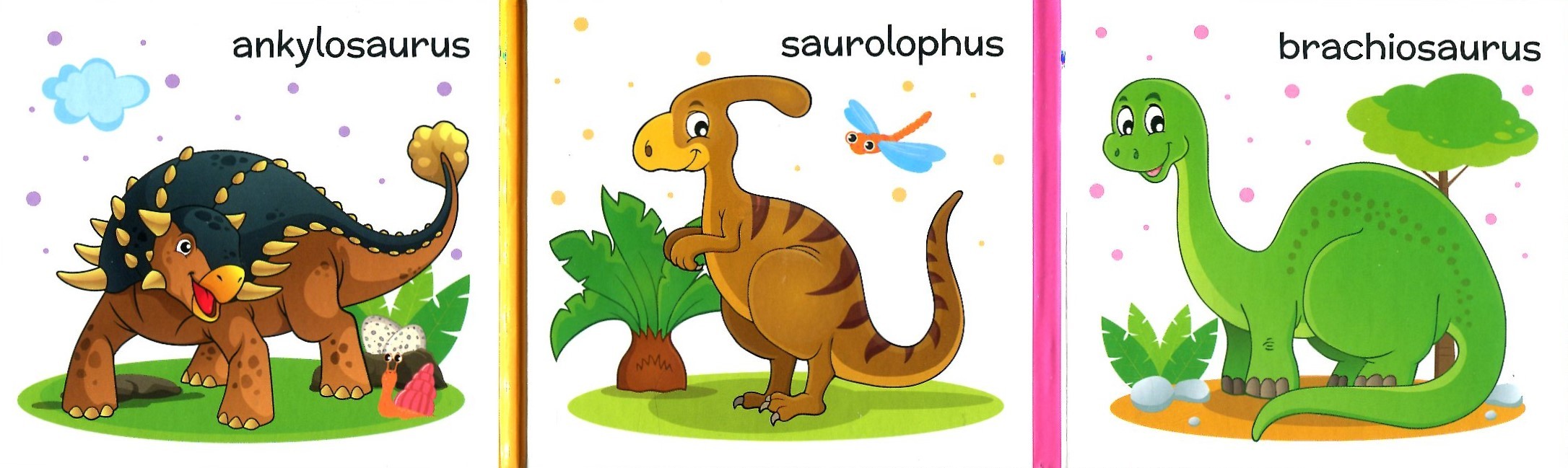 Pestrobarevné harmonikové leporelo pro nejmenší děti s veselými obrázky dinosaurů.