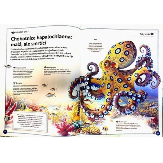 Fascinující výprava do mořských hlubin od autorky Manueli Román s ilustracemi Pippy Boom nabízí úchvatný a detailní průzkum mořského života. Díky bohatým a zdařilým ilustracím se čtenáři ponoří do úžasného světa mocných mořských živočichů a mohou si představit, jak vypadá život od barevných útesů až po temné hlubokomořské příkopy. Kniha představuje rozmanitost světových oceánů a moří, které jsou domovem mnoha druhů rostlin a živočichů, a seznamuje nás s neuvěřitelnými obyvateli dosud málo prozkoumaných hlubin. Čtenáři se dozvědí, jak se jednotlivé druhy přizpůsobily životu pod hladinou, jakou ekologickou roli v mořských ekosystémech hrají, a jaké výzvy musí v tomto proměnlivém prostředí překonávat. Tato dobrodružná výprava do hlubin oceánů odhaluje, proč obyvatelé moří stále fascinují a představují nevyčerpatelný zdroj inspirace. Kniha zdůrazňuje lokalizaci jednotlivých druhů, jejich adaptaci na chlad, stravovací návyky a ekologické vazby, což ji činí nejen vzdělávací, ale i strhující četbou pro všechny zájemce o mořskou přírodu a dobrodružství. Díky velkoformátovým ilustracím se tato velká XXL encyklopedie určitě stane chloubou vaší rodinné knihovny.