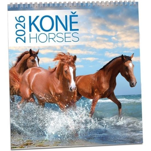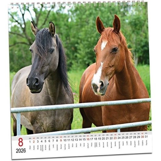 Nástěnný kalendář na rok 2026 s tematickými obrázky a měsíčním kalendáriem.
