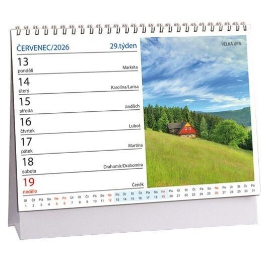 Stolní kalendář na rok 2026 s tematickými obrázky a týdenním zapisovacím kalendáriem.