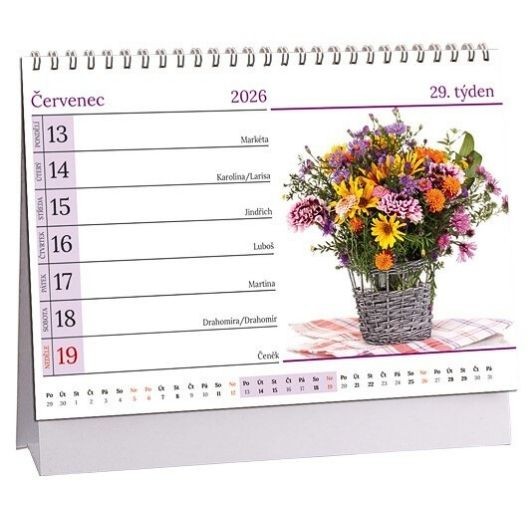 Stolní kalendář na rok 2026 s tematickými obrázky a týdenním zapisovacím kalendáriem.