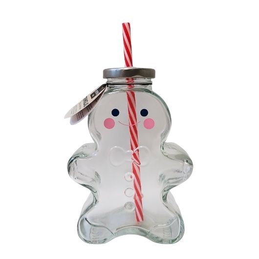 Skleněná lahev s brčkem ve tvaru perníčku, objem je 440 ml.