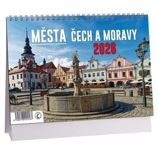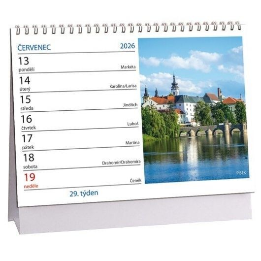 Stolní kalendář na rok 2026 s tematickými obrázky a týdenním zapisovacím kalendáriem.