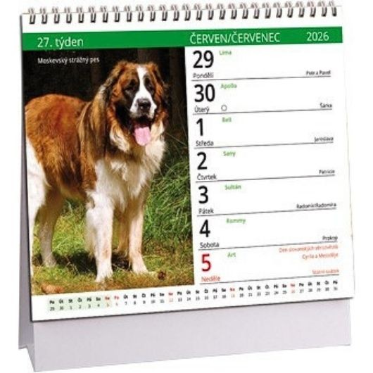 Stolní mini kalendář na rok 2026 s tematickými obrázky a týdenním zapisovacím kalendáriem.