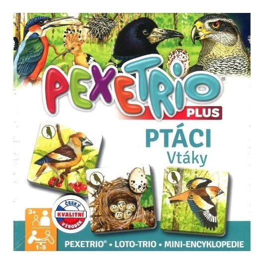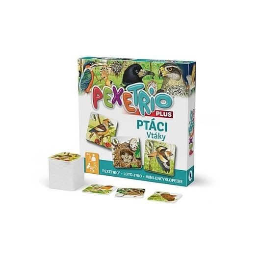 Pexetrio Ptáci je didaktická a zábavná hra, ve které se naučíte pojmenovat různé ptáky, poznávat jejich hnízda s vejci a letovou podobu.