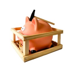 Pokladnička v podobě keramického prasátka s ohrádkou. Pokladnička nemá ve spodní části otvor pro vyjmutí peněz, z tohoto důvodu je součástí balení i malé kladívko, kterým se prasátko může rozbít.