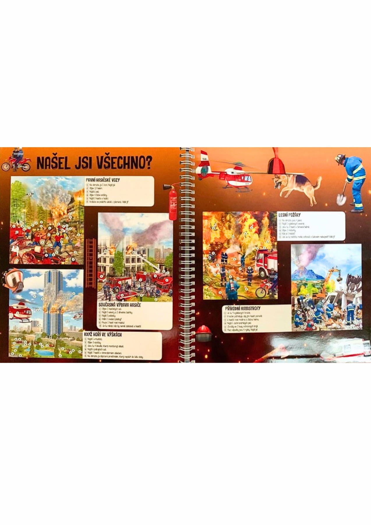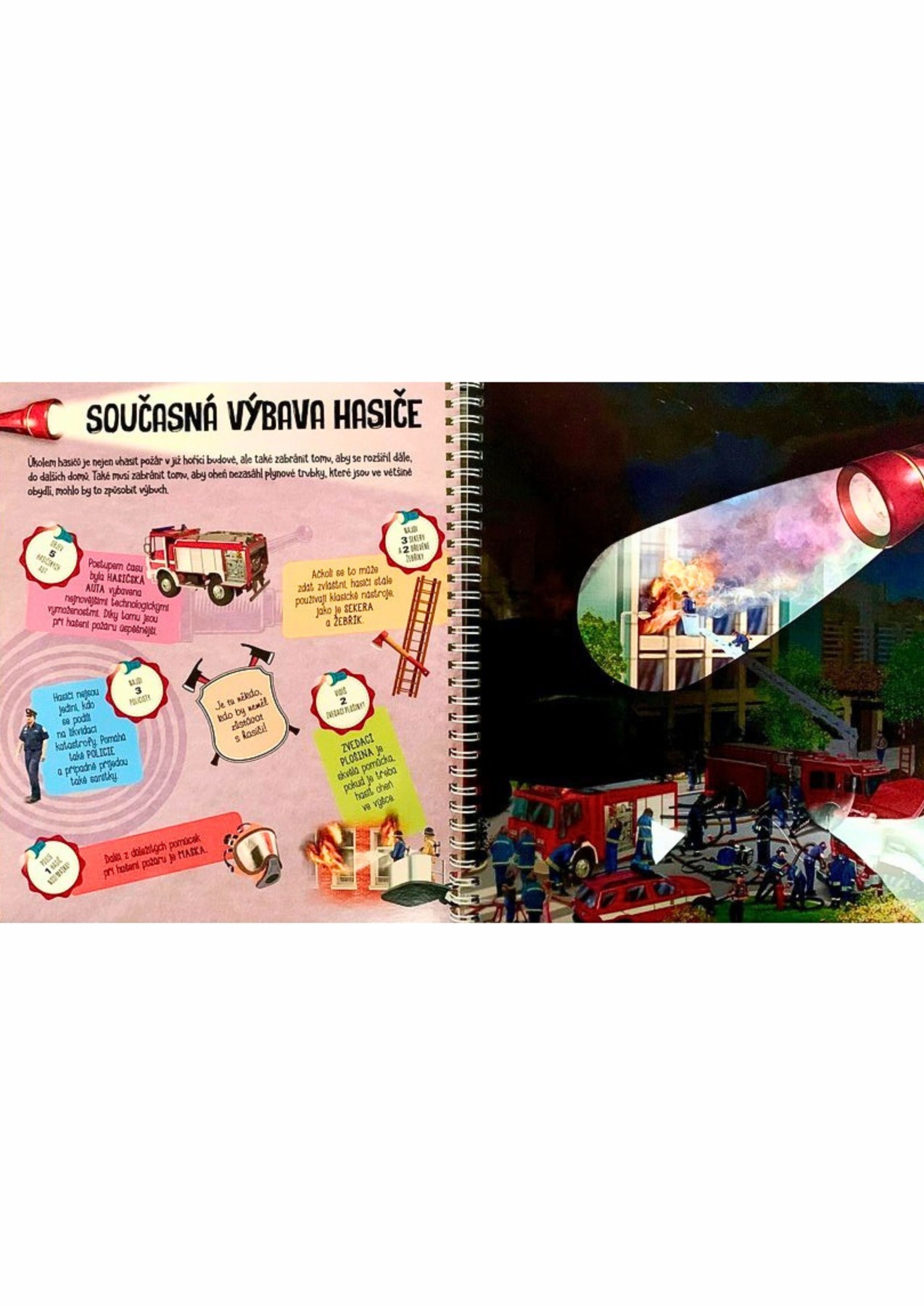 Posviť si na obrázky baterkou a objevíš všechno, co se ukrývá ve tmě. Hledej, objevuj a poznej Hasiče. Zjisti jak vypadali první hasičské vozy. Poznej jaká je současná výzbroj hasiče. Zjisti jak se hasí lesní požáry, nebo požáry ve výškách