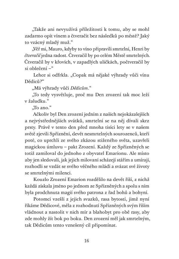 Když vzplanou stará tajemství, všechno kolem shoří. Světu smrtelných vládnou krutí Dědicové, potomci samotných bohů, kteří kdysi osídlili devět říší Emarionu. Diem Bellatorová se pokouší nevyčnívat, ale vskrytu duše touží opustit svou chudou, uzavřenou vesnici. Když náhle zmizí její matka, která skrývala nebezpečné tajemství, Diem se naskytne nečekaná příležitost vstoupit do temného světa královské rodiny Dědiců a začít rozplétat klubko záhad, jež za sebou matka zanechala. Na každém kroku ji sleduje pohledný, záhadný nástupce umírajícího krále. K tomu je tu skupina smrtelných, která se ji pokouší zlákat, aby se i ona zapojila do blížící se občanské války. Diem se musí naučit orientovat v nepsaných pravidlech lásky, moci a politiky, aby zachránila nejen svou rodinu, ale s ní i všechny smrtelné.