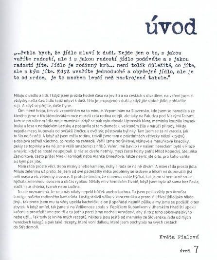 Ochutnejte tuto knihu, převažují nápadité recepty, které vycházejí z Květiny fantazie. Podle nich vykouzlíte neobvyklé saláty, polévky, herecké rychlovky a také se dozvíte, jak připravit lehká zeleninová jídla, středomořské speciality, ryby, drůbež i tradiční dezerty. Květa Fialová vynikala nejen jako herečka, ale i jako kuchařka, která celý život ráda vařila, a to nejraději pro ostatní. Recepty provází Květa svým komentářem a vzpomíná na zákulisí své domácí kuchyně. V kuchařce nechybějí ani vzpomínky na rodinu, herecké přátele a na maminku, za kterou se Květa celý život vracela na Slovensko. Právě od ní pochází řada původních slovenských receptů. Každý recept je doplněn uměleckou fotografií servírování pokrmu od přední české divadelní fotografky Aleny Hrbkové, se kterou se Květa často potkávala na své domovské scéně v Divadle ABC. V kuchařce dále najdete fotografie z rodinného alba Květy Fialové, z nichž mnohé ještě nikdy nebyly zveřejněny.
