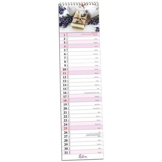 Oblíbený úzký nástěnný kalendář na rok 2026 s tematickými obrázky a měsíčním zapisovacím kalendáriem.