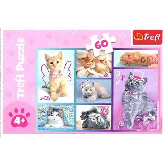 Puzzle pro děti od 4 let s motivem kočiček, které se skládá z 60 dílků. Velikost složeného obrázku je 33 x 22 cm.