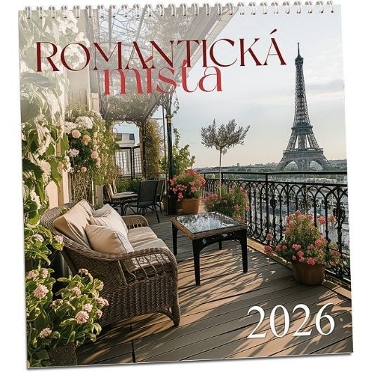 Nástěnný kalendář na rok 2026 s tematickými obrázky a měsíčním kalendáriem.