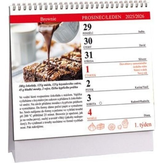 Stolní mini kalendář na rok 2026 s recepty na sladké pečení a týdenním zapisovacím kalendáriem.