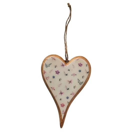 Závěsná dekorace s motivem domku s ptáčkem a květinami.
