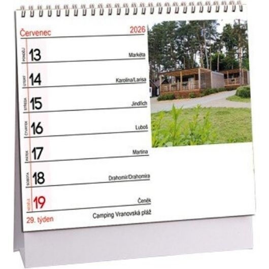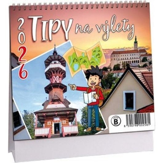 Stolní mini kalendář na rok 2026 s tematickými obrázky, upoutávkou na turisticky zajímavá místa v České republice a týdenním zapisovacím kalendáriem.