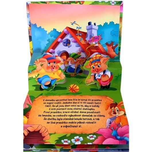 Hledáte-li dokonalý dárek pro malé čtenáře, prostorová kniha Tři prasátka je tou pravou volbou. Klasický příběh o třech prasátkách a zlém vlkovi zde ožívá díky úžasným 3D ilustracím, které vystupují z každé stránky a vtáhnou děti přímo do děje. Každé otočení stránky přináší nové překvapení – prasátka staví své domečky, vlk se snaží sfouknout jejich střechy a napětí i zábava graduje až do šťastného konce. Kniha je navržena speciálně pro malé dětské ručičky – má ideální formát. Veselé ilustrace a legrační detaily podporují dětskou fantazii a rozvíjejí vztah ke čtení. Díky prostorovým (pop-up) prvkům působí postavičky i scény jako živé a děti si mohou příběh doslova „osahat“. Tři prasátka jsou nejen zábavné čtení, ale i krásný vizuální zážitek, který potěší každé dítě.