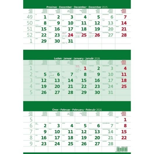 Praktický nástěnný tříměsíční plánovací kalendář na rok 2026 v zelené barvě s orientační lištou a posuvným jezdcem.
