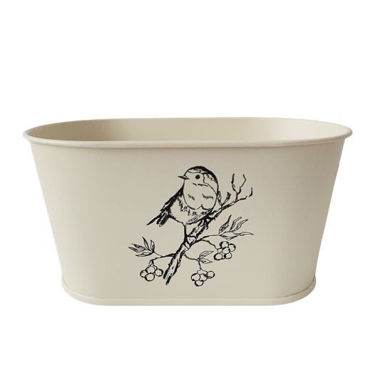Kovový truhlík v šedé barvě s motivem ptáčka na větvičce.