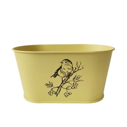 Kovový truhlík v šedé barvě s motivem ptáčka na větvičce.