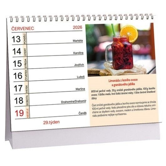 Stolní kalendář na rok 2026 s chutnými kulinářskými recepty a týdenním zapisovacím kalendáriem.