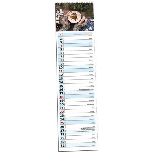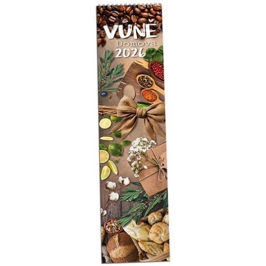 Oblíbený úzký nástěnný kalendář na rok 2026 s tematickými obrázky a měsíčním zapisovacím kalendáriem.