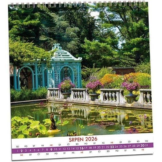 Nástěnný kalendář na rok 2026 s tematickými obrázky a měsíčním kalendáriem.