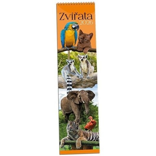 Oblíbený úzký nástěnný kalendář na rok 2026 s tematickými obrázky a měsíčním zapisovacím kalendáriem.